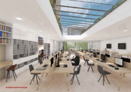 Opération dans un bâtiment ancien, avec la structure existante et des équipements à adapter au projet (démolition d’une dalle existante pour créer la verrière, complexité d’emplacement des locaux techniques), dépose de coffres fort d’une ancienne banque. Zone soumise au PPRi. Création d’un mur rideau. Mise aux normes de sécurité incendie.